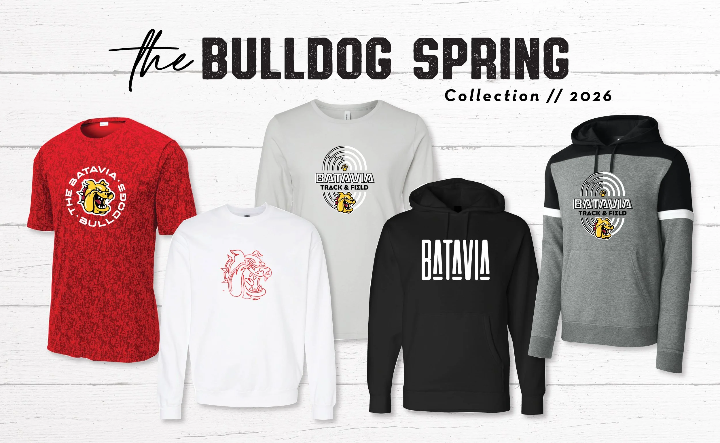 The Spring 2026 Batavia Bulldogs Spirit Wear Collection features two new designs: Batavia Lanework, a track & field-inspired look, and Bulldog Rally, a bold, classic Bulldog design. The collection also includes a selection of in-stock styles, giving Batavia families a mix of new and ready-to-wear options for the season. With a range of styles and fits available, there’s something for both everyday wear and showing your Bulldog pride.